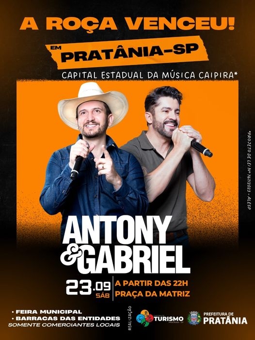 A Prefeitura de Pratânia, através da Diretoria de Cultura e Turismo, realiza o evento "A Roça Venceu!", com o show da dupla Antony & Gabriel.