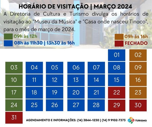 A Diretoria de Cultura e Turismo do município de Pratânia comunica os horários de visitação ao "Museu da Música" e à "Casa onde nasceu Tinoco", para o mês de março de 2024.