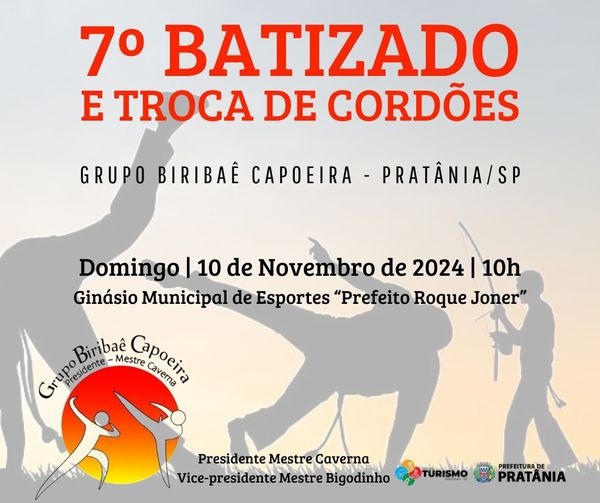 A Prefeitura de Pratânia, através da Diretoria de Cultura e Turismo, em parceria com o Mestre Bigodinho, responsável pelo projeto do Grupo Biribaê Capoeira, de Pratânia, realizará o 7º Batizado e Troca de Cordões.