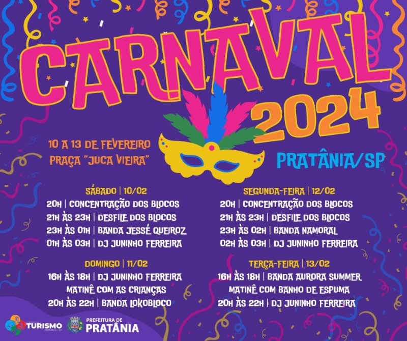O Carnaval 2024 está chegando, e você não pode perder! De 10 a 13 de fevereiro, prepare-se para quatro noites e duas matinês repletas de diversão. O evento contará com a presença de atrações musicais, prometendo animar ainda mais a folia!