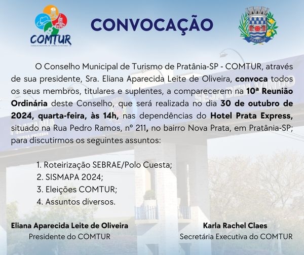 O Conselho Municipal de Turismo de Pratânia-SP - COMTUR, através de sua presidente, Sra. Eliana Aparecida Leite de Oliveira, CONVOCA todos os seus membros, titulares e suplentes, a comparecerem na 10ª Reunião Ordinária deste Conselho, que será realizada no dia 30 de outubro de 2024, quarta-feira, às 14h, nas dependências do Hotel Prata Express, situado na Rua Pedro Ramos, nº 211, no bairro Nova Prata, em Pratânia-SP; para discutirmos os seguintes assuntos: