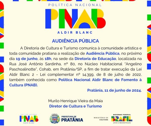 A Prefeitura de Pratânia, por meio da Diretoria de Cultura e Turismo, informa que na próxima quarta-feira, dia 19 de junho, às 18h, será realizada a primeira Audiência Pública, para discutir o PAAR – Plano Anual de Aplicação de Recursos da PNAB (Política Nacional Aldir Blanc de Fomento à Cultura).