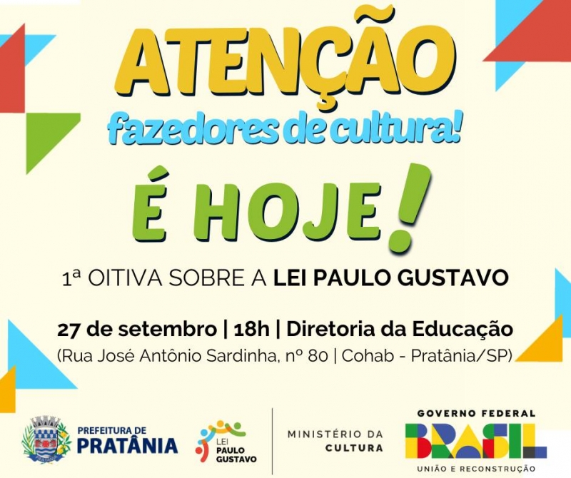A Prefeitura de Pratânia, por meio da Diretoria de Cultura e Turismo, convida toda a população e os "fazedores de cultura" como: artesãos, atores, compositores, músicos, profissionais do audiovisual e demais artistas para se reunirem hoje, quarta-feira, 27 de setembro, às 18h, na sede da Diretoria da Educação, na Rua José Antônio Sardinha, nº 80, no Núcleo Habitacional "Angelino Pasqualinotte" - Cohab, em Pratânia/SP, com o objetivo de assegurar a participação democrática de toda a sociedade pratiana na implementação da Lei Complementar nº 195 de 08 de julho de 2022 (Lei Paulo Gustavo), que dispõe sobre apoio financeiro da União aos Estados, ao Distrito Federal e aos Municípios para garantir ações emergenciais direcionadas aos setores culturais impactadas, diretamente, pelas medidas de restrição impostas pela Covid-19.