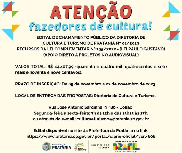 EDITAL DE CHAMAMENTO PÚBLICO DA DIRETORIA DE CULTURA E TURISMO DE PRATÂNIA Nº 01/2023