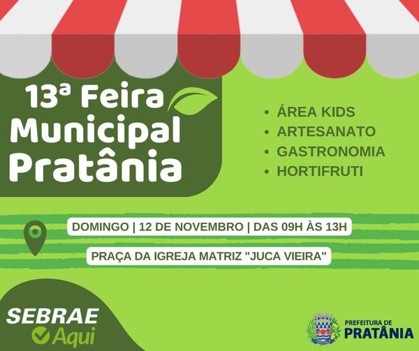 Com o objetivo de fomentar a economia local e atrair novos turistas para o Município, a 13ª edição da Feira Municipal acontecerá no próximo domingo, dia 12 de novembro, das 09h às 13h, na Praça da Igreja Matriz "Juca Vieira".