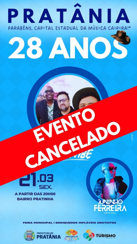 A Prefeitura de Pratânia, através das Diretorias de Cultura e de Turismo, informa a todos que, em razão do falecimento do servidor público Antônio Aléks de Oliveira (Alemão), o evento programado para acontecer no bairro Pratinha, nessa sexta-feira, dia 21 de março, foi cancelado.