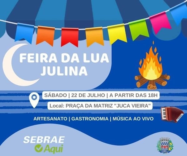 O evento acontece neste sábado, dia 22 de julho, a partir das 18h, em frente a Praça da Igreja Matriz "Juca Vieira", e contará com a nossa tradicional feira de artesanato, gastronomia, música ao vivo e muito mais.