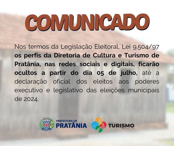Em atendimento à Lei Eleitoral 9.504/97, os perfis da Diretoria Municipal de Cultura e Turismo de Pratânia, nas redes sociais e digitais, ficarão ocultos a partir de 05 de julho, até a declaração oficial dos eleitos aos poderes executivo e legislativo das eleições municipais de 2024.