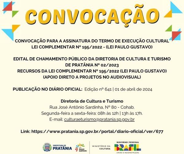 A Prefeitura de Pratânia, através da Diretoria de Cultura e Turismo, divulgou nesta segunda-feira, 01, o Edital de Convocação para a Assinatura do Termo de Execução Cultural da Lei Complementar Nº 195/2022 (Lei Paulo Gustavo).