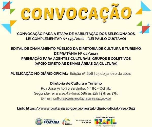 A Prefeitura de Pratânia, através da Diretoria de Cultura e Turismo, publicou nesta quinta-feira, 25, o edital de convocação dos selecionados da Lei Complementar Nº 195/2022 (Lei Paulo Gustavo), para a etapa de habilitação.