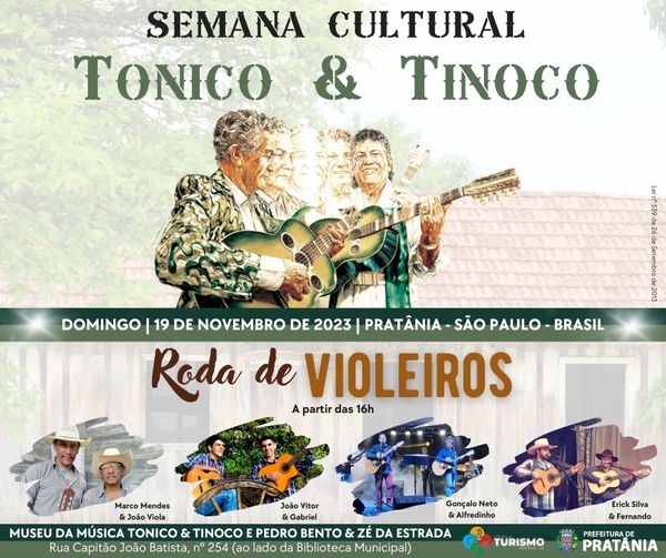 O evento, que acontecerá no Museu da Música, terá o seu ápice no domingo, dia 19 de novembro, a partir das 16h, com a Roda de Violeiros, que contará com a participação das duplas Marco Mendes & João Viola, João Vitor & Gabriel, Gonçalo Neto & Alfredinho e Erick Silva & Fernando.