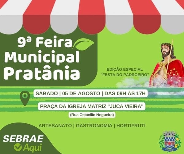 A Prefeitura de Pratânia, através das diretorias de Agricultura, Meio Ambiente, Cultura e Turismo, em parceria com SEBRAE AQUI, realizará a 9ª edição da Feira Municipal.