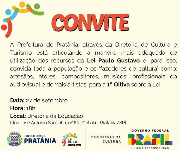 A Prefeitura de Pratânia, por meio da Diretoria de Cultura e Turismo, convida toda a população e os "fazedores de cultura", como: artesãos, atores, compositores, músicos, profissionais do audiovisual e demais artistas para se reunirem na quarta-feira, dia 27 de setembro, às 18h, na sede da Diretoria da Educação, na Rua José Antônio Sardinha, nº 80, no Núcleo Habitacional "Angelino Pasqualinotte" - Cohab, em Pratânia/SP.