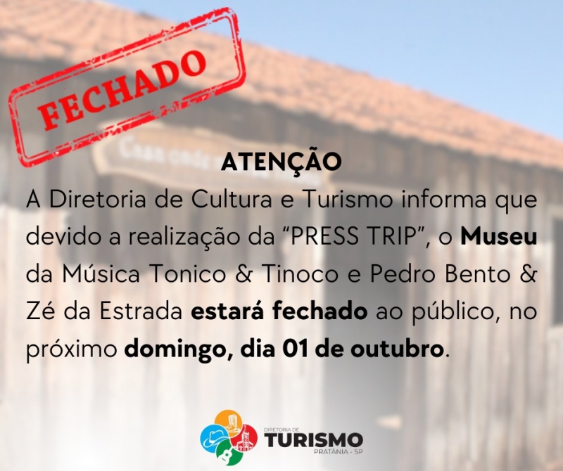 A Diretoria de Cultura e Turismo informa que devido a realização da "Press Trip", o Museu da Música Tonico & Tinoco e Pedro Bento & Zé da Estrada estará fechado ao público, no próximo domingo, dia 01 de outubro.