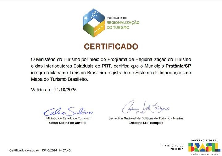 Além de certificar o município, o Ministério do Turismo também reconheceu o Conselho Municipal de Turismo (COMTUR) de Pratânia, destacando seu papel fundamental na governança e na promoção de políticas voltadas ao turismo. A certificação reflete o esforço conjunto entre os órgãos locais e estaduais de turismo, garantindo que o município continue avançando no fomento ao setor.