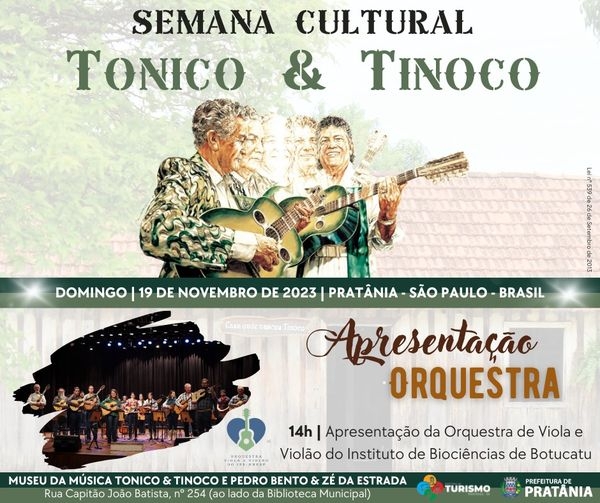 O evento, que acontecerá no Museu da Música, terá o seu ápice no domingo, dia 19 de novembro, com a apresentação da Orquestra de Viola e Violão do Instituto de Biociências, da Unesp, de Botucatu, às 14h.