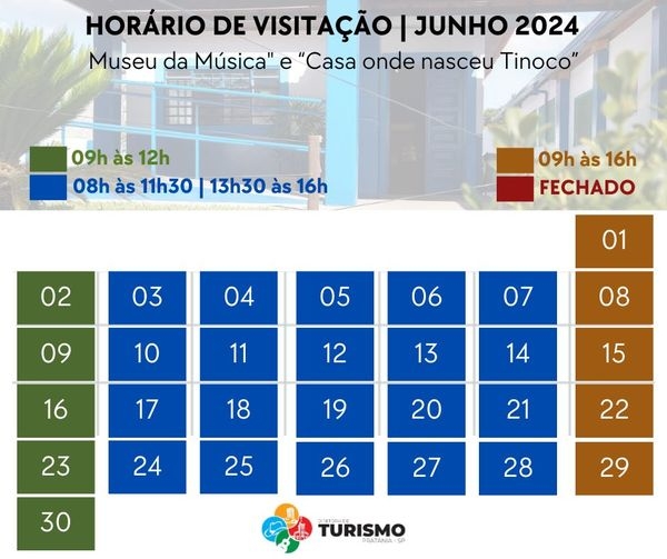 A Diretoria de Cultura e Turismo divulga os horários de visitação ao Museu da Música e à Casa onde nasceu Tinoco, no mês de junho de 2024.