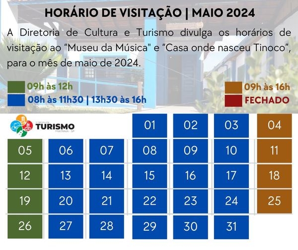 A Diretoria de Cultura e Turismo divulga os horários de visitação ao Museu da Música e à Casa onde nasceu Tinoco.